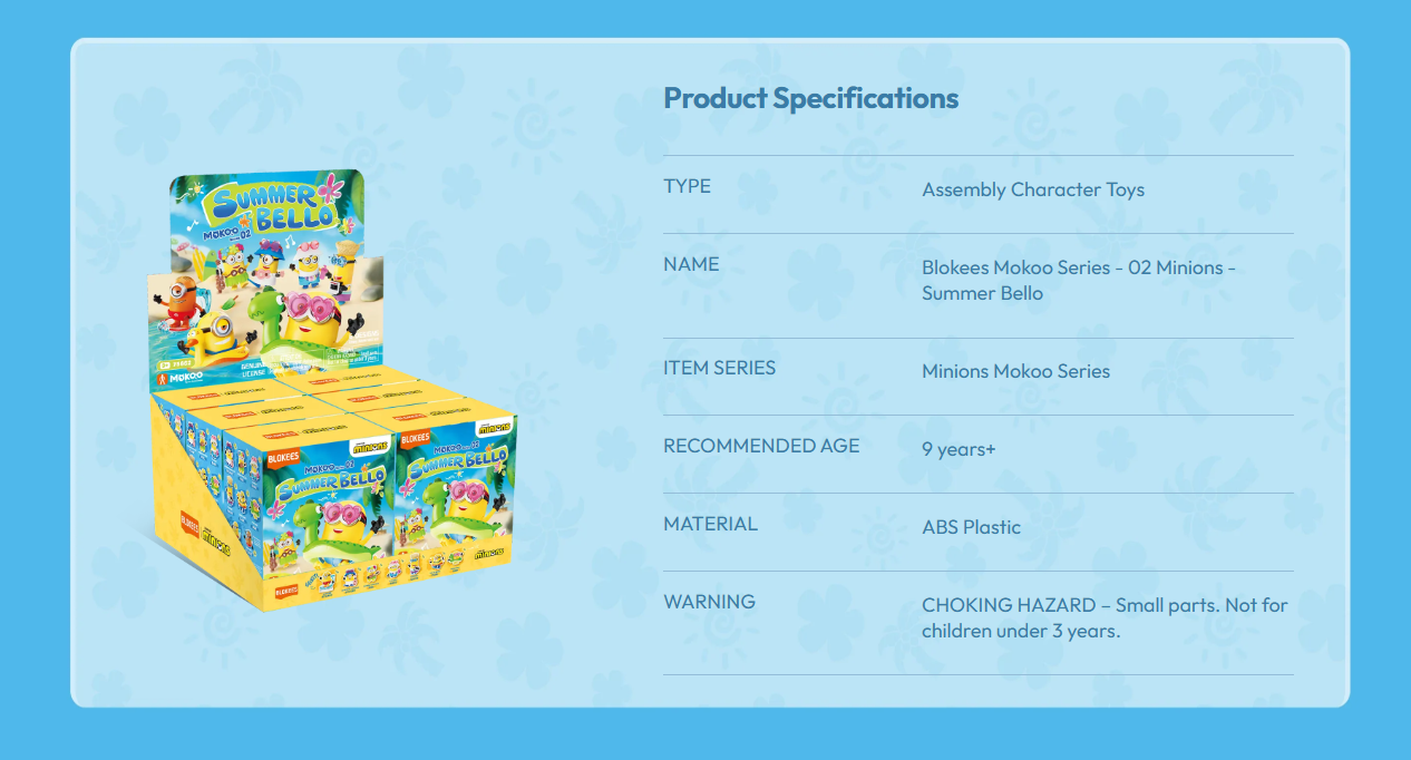 Each box contains 1 random Minion variant from the Mokoo Series 02 – Summer Bello collection. The exact character inside remains a surprise until opened, making it perfect for collectors who enjoy the thrill of mystery figures.