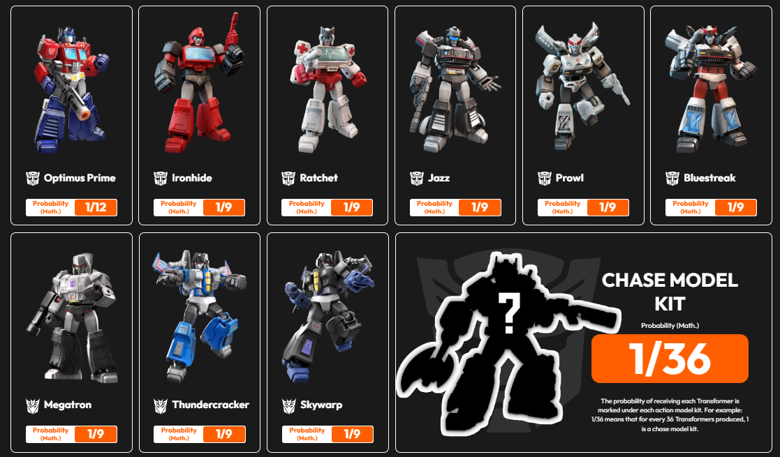 The single box package contains one Blokees Transformers model kit. It could randomly be a basic model kit or a special model kit. |