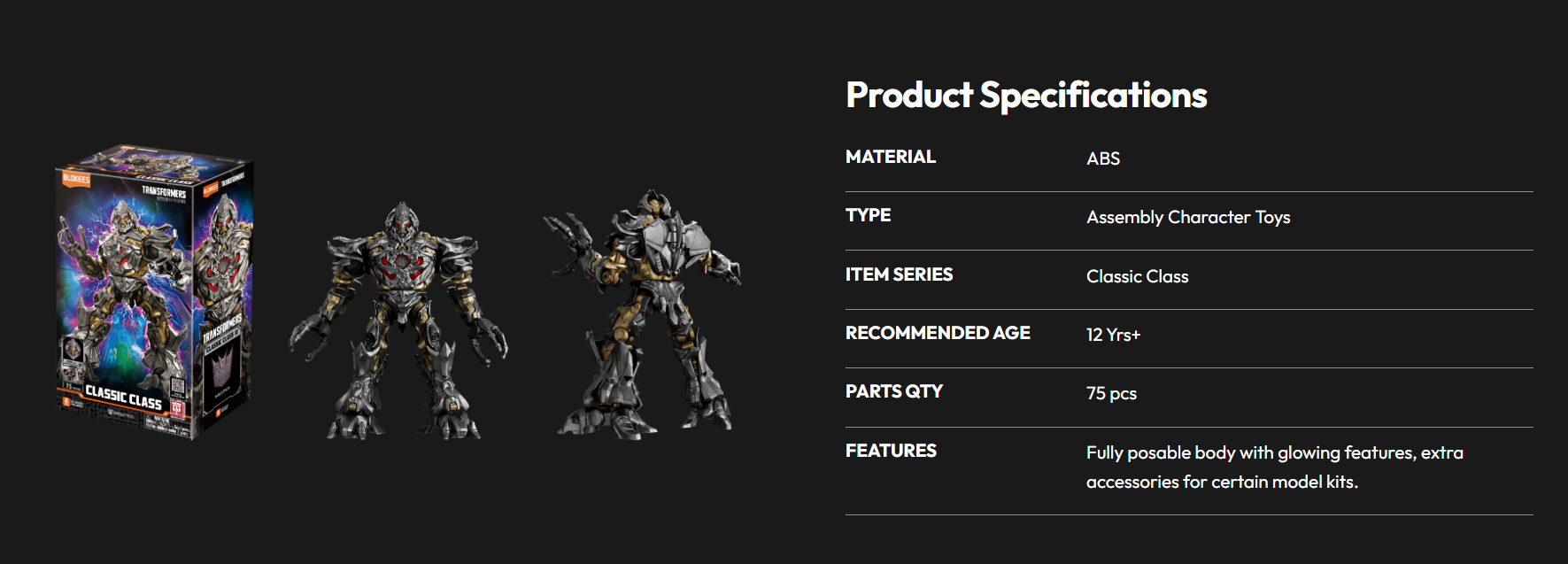 Designed with character-accurate detailing and articulated joints, this Classic Class edition captures Megatron’s powerful and commanding presence. Once assembled, the figure is fully poseable, making it a striking addition to any Transformers collection — especially alongside Optimus Prime.