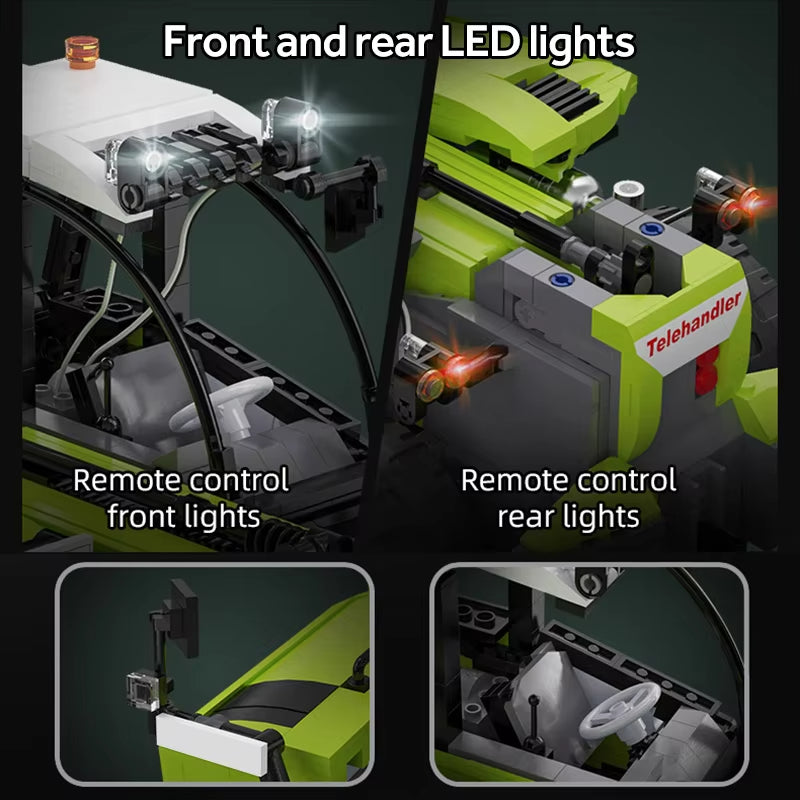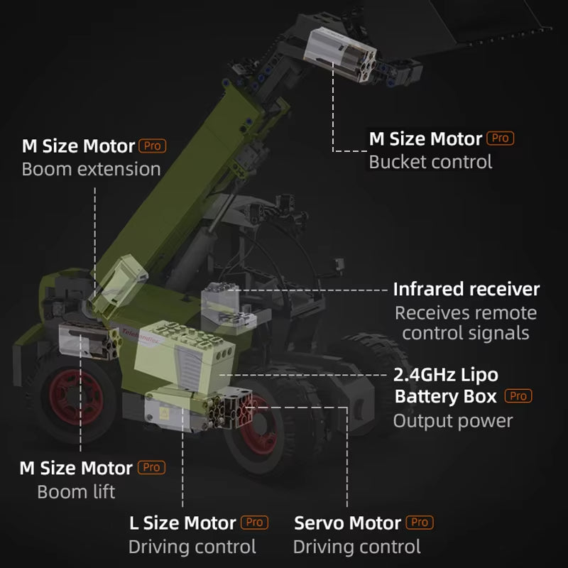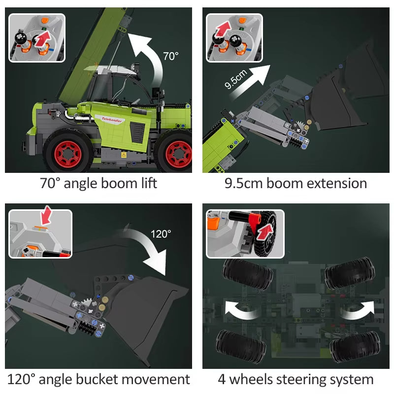 Full RC control: forward/backward, left/right, boom lift, boom telescoping; interchangeable bucket and forks; detailed cab with steering and mirrors