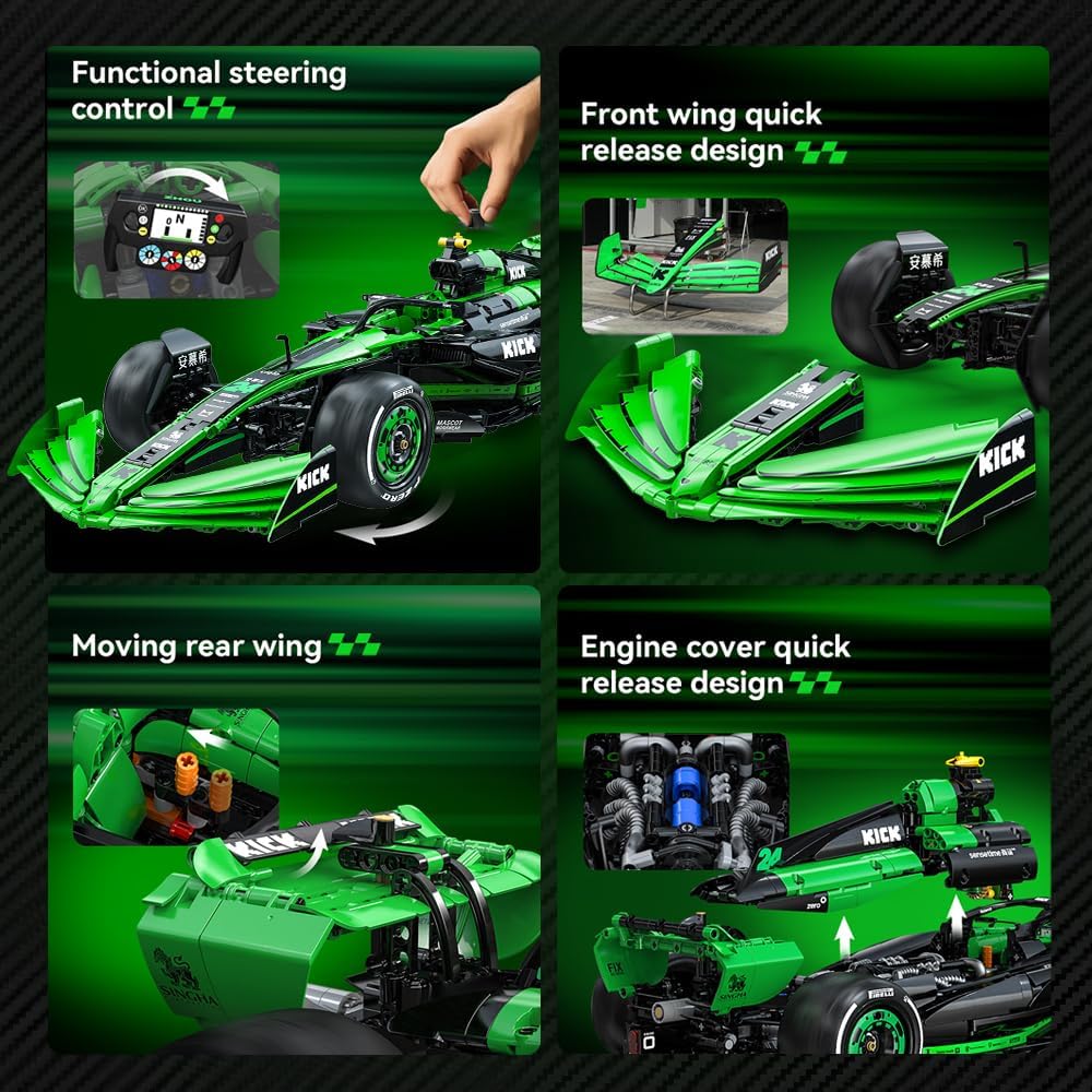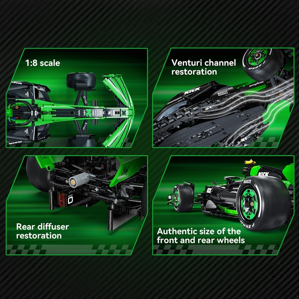 Feel the exhilaration of elite motorsport engineering with the CaDA C64010W – KICK Sauber F1 Team C44 1:8, a precision-crafted 2,553-piece model that faithfully replicates the striking 2024 Formula 1 race car in its fluorescent green and black team livery. This premium build brings aerodynamic authenticity to life with detailed front and rear wings, halo roll cage, and Venturi channel features, while interactive elements like steering functionality and opening engine and rear-wing components add depth to both the build and display experience—ideal for advanced builders and racing enthusiasts alike.
