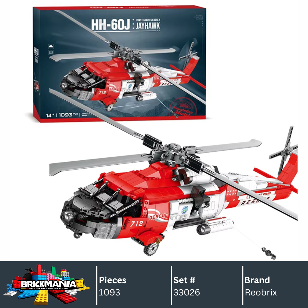 Feel the spirit of precision aeronautics with the Reobrix 33026 – HH‑60J Jayhawk Rescue Helicopter 1:18, a detailed 1,137‑piece model inspired by the U.S. Coast Guard’s legendary search and rescue aircraft. This build brings to life the distinctive silhouette of the HH‑60J with realistic rotor assemblies, functional tail propeller, and a detailed cockpit and rescue equipment setup. Designed for aviation and military enthusiasts, it offers a satisfying balance of complexity and display appeal—perfect for model collectors and advanced builders who appreciate authentic aircraft styling and build quality.